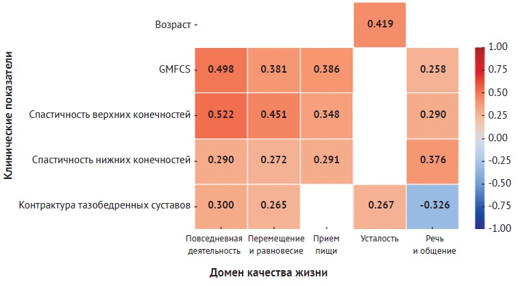 Рис. 2. Корреляции клинических показателей с доменами качества жизни PedsQL