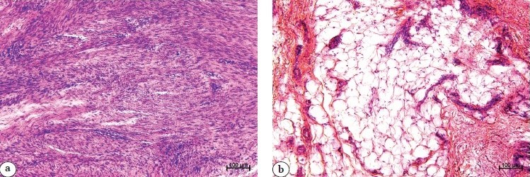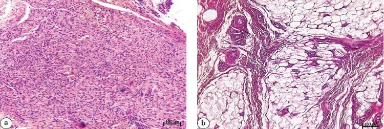 Figure 2. Paraffin sections of the surgical material from a Group 2 patient: a — hyperplastic connective tissue with sparse vessels and high cellular density; b — vessels with fibrously changed thickened walls predominate in adipose tissue. Hematoxylin and eosin staining. Magnification ×100