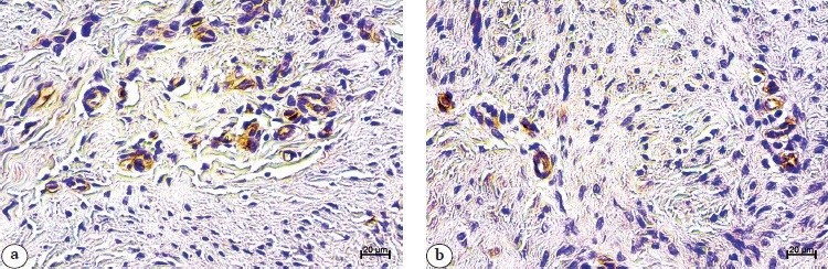 Figure 3. Рaraffin sections of the surgical material from a Group 1 patient (a) and from a Group 2 patient (b). Expression of CD34 in the endothelium of microcirculatory vessels in hyperplastic connective tissue is observed. Immunohistochemical reaction with antibodies to CD34, сounterstaining with hematoxylin. Magnification ×400