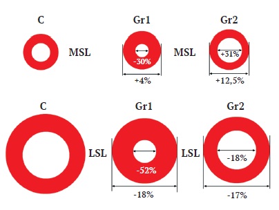 Figure 4. Conditional scaling of the morphometric parameter ratios of the perforating arteries of the palmar aponeurosis in patients with Dupuytren’s contracture compared to controls: C — controls (norm); Gr1 — a group with rapidly progressive contracture; Gr2 — a group with typically progressive contracture; MSL — medium caliber arteries; LSL — large caliber arteries