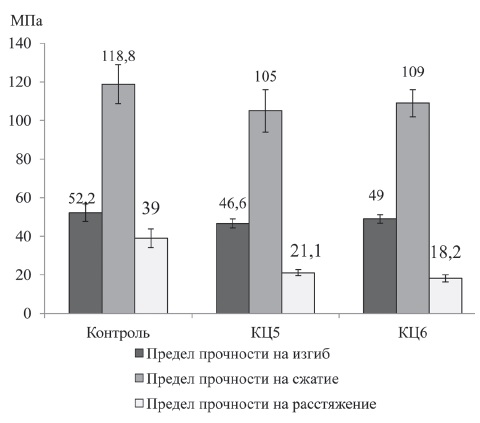 The registration, systematization of initial data, and visualization of the obtained results were performed in Microsoft Office Excel spreadsheets. Statistical analysis was conducted using the Past 4 software system. Normality of distribution of quantitative variables was tested using graphical method and showed that the results obtained in determining the strength of the samples corresponded to a normal distribution. For the description of a variable, the mean value and 95% confidence interval (95% CI) were used. Comparison of quantitative variables between groups of samples was performed using the Student’s t-test. The differences were considered statistically significant at p<0.05.