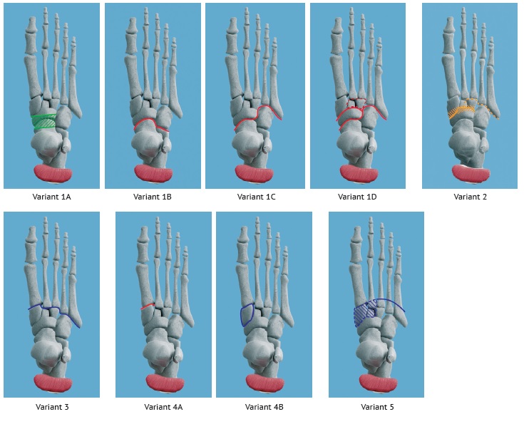 - dislocation of the intermediate and lateral cuneiform bones either in plantar direction together with the cuboid bone or dorsally along with the metatarsals;