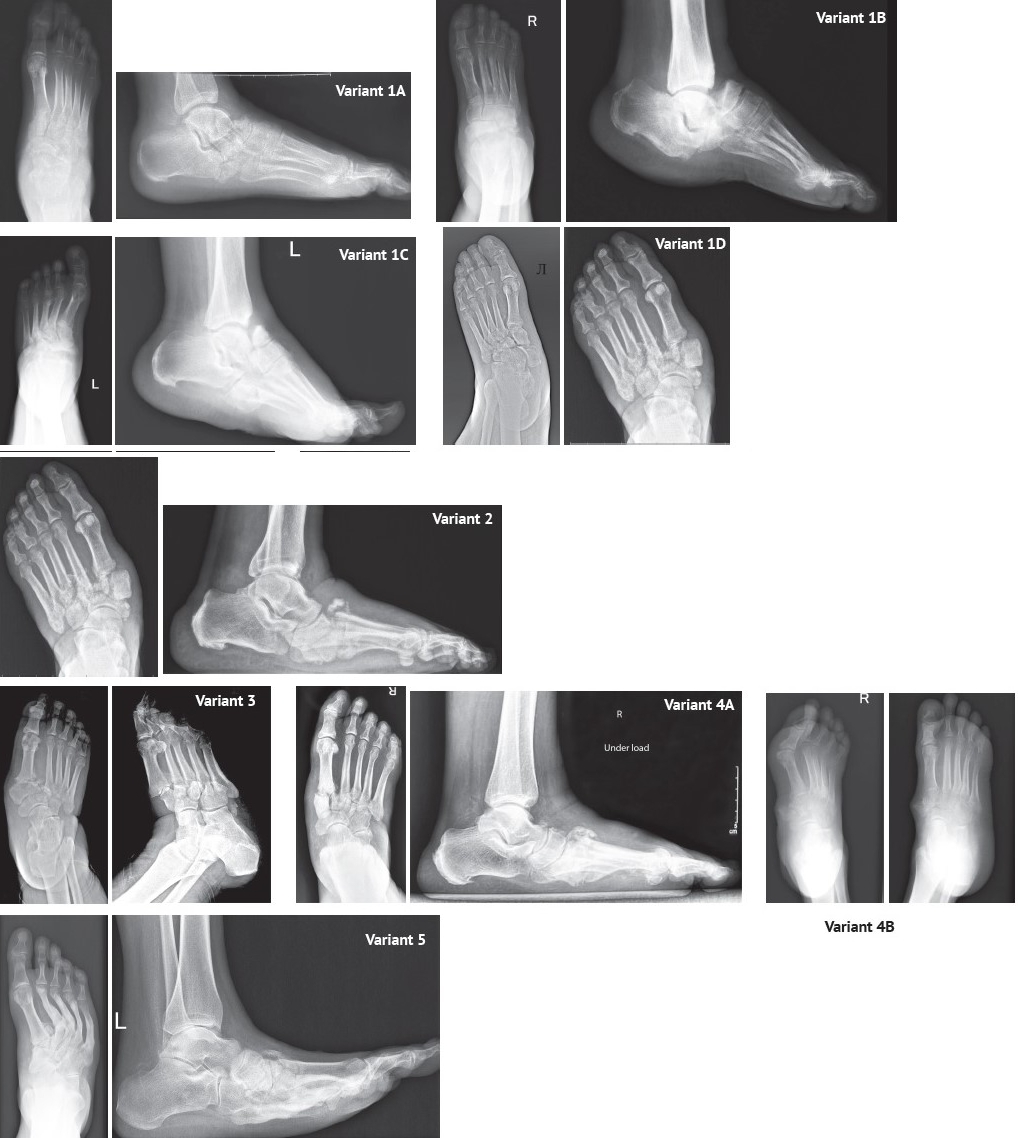 Variant 2. Deformity (subluxation, dislocation, or fracture-dislocation) of the naviculocuneiform joint, possibly involving the lateral column at the cuboid-metatarsal joint, with progressive deformity and flattening of the medial column. This subtype is characterized by:
