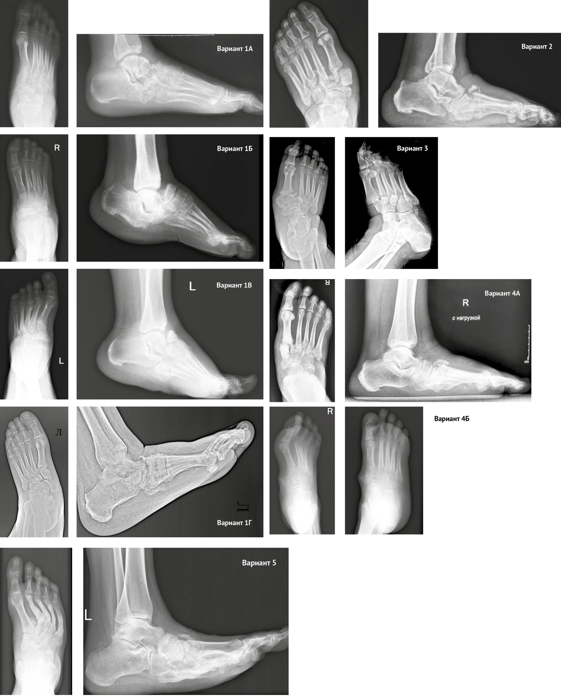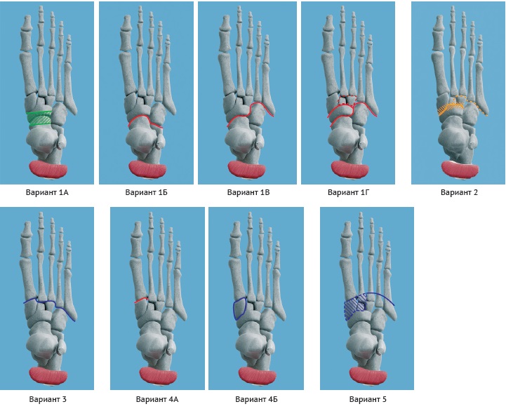 Based on the analysis of X-rays, nine primary types of typical midfoot bone displacements were identified, which in many aspects differ from those described in existing classification systems. The variants were numbered from 1 to 5, proceeding from the hindfoot toward the forefoot. In addition to the main numbering, two variants (1 and 4) were subdivided into subtypes based on the specific features of involvement within the same type. The displacement characteristics for each variant are descri-bed below.