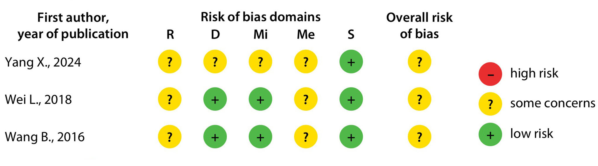 According to the RoB 2 system algorithms, all CTs included in the review raised concerns regarding the overall risk of bias (Figure 3). All CTs had a moderate risk of bias related to randomization, as none of them used allocation concealment as a measure to protect the randomization process. The risk of bias related to deviations from the intervention protocol was assessed as moderate for the CT by X. Yang et al., based on the repor-ted significant impact of low adherence to the protocol on one of the endpoints, as well as the absence of pharmacological therapy in the negative control group. For this same CT, the risk of bias related to missing endpoint data was also assessed as moderate due to the absence of relevant data for more than 10% of participants [27]. All included CTs raised concerns regarding the risk related to endpoint assessment, due to the lack of blinding of both participants and medical staff. The risk of bias related to the selective reporting of results was assessed as low in all cases.