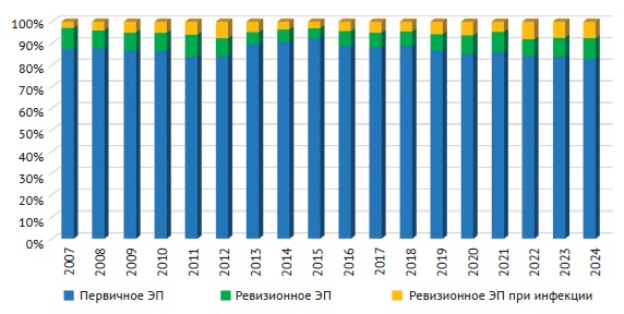 There is a sharp increase in the number of revision procedures, a growing proportion of complex revisions requiring advanced and costly implants, and an exceptionally rapid rise in the number of infection-related revisions. It is therefore clear that the challenges of revision arthroplasty may soon affect all surgeons performing primary total hip arthroplasty — initially through the need to manage infectious complications, and later due to the gradual accumulation of patients requiring other types of revisions, including repeat procedures.