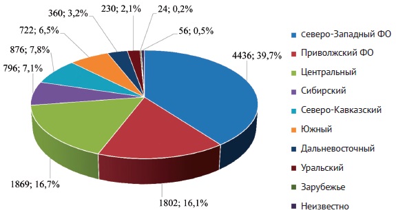 The majority of patients undergoing revision procedures recorded in the registry are residents of the Northwestern Federal District. The Central Federal District ranks second, followed closely by the Volga Federal District. Residents of other federal districts are represented in smaller numbers (Figure 4).