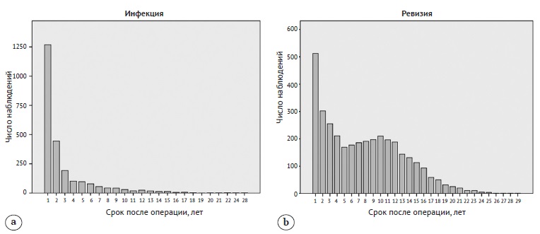 Figure 6. Distribution of revisions due to infection (a) and aseptic loosening (b) by time since the previous surgery