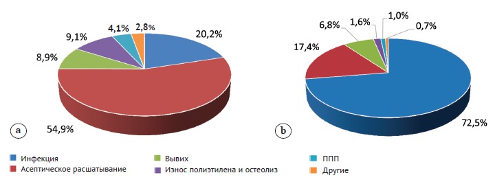 Figure 9. Proportion of different causes of revision: a – after primary THA; b – after re-revisions