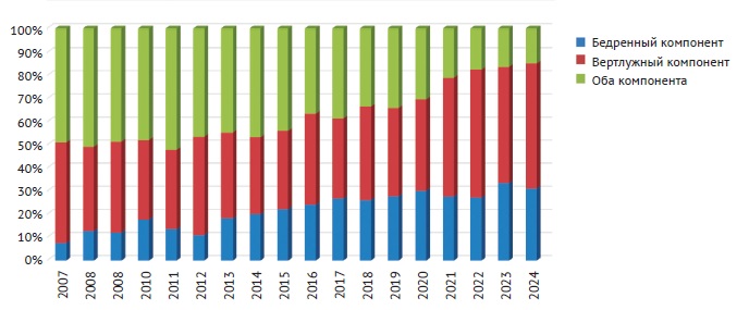The absence of a national THA registry in the Russian Federation hinders the collection of comprehensive data on the prevalence, structure, and actual effectiveness of both primary and revision THA procedures performed in domestic healthcare facilities. Consequently, only isolated publications based on large datasets, including local databases, offer approximate insights into the population characteristics of Russian patients and current trends in this area of trauma and orthopedic surgery [10, 17, 18]. The most recent analysis of revision surgery structure, based on the data from the local registry of the Vreden National Medical Research Center of Traumatology and Orthopedics, was conducted in 2019 and revealed an almost twofold increase in the proportion of early revisions following primary total THA – from 19.6 to 37.4% [11, 17].