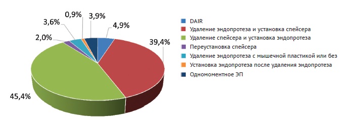 - first stage – removal of the prosthesis and debridement;