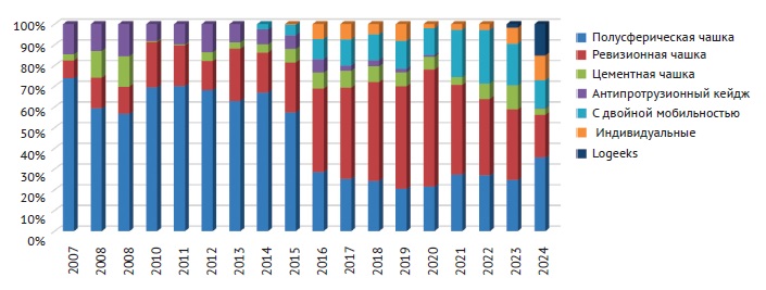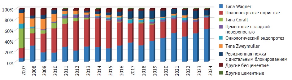 - For femoral component revision, there is a steady trend towards using Wagner-type tapered fluted titanium components. Their share increased from 39.4% in 2019 to 61.7% in 2024.