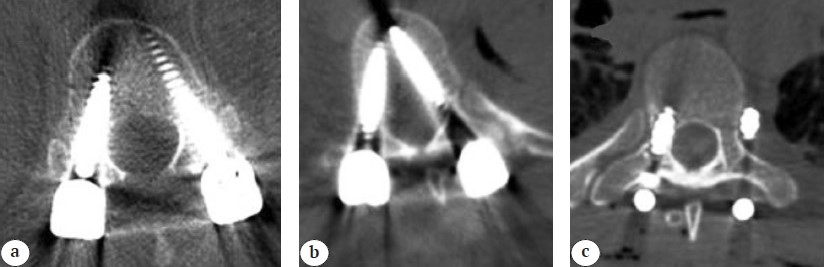 Figure 1. Postoperative CT scans assessing the accuracy of pedicle screw placement of: a — a 35-year-old female with L1 fracture post-fixation with T12, showing screws within the pedicle; b — a 43-year-old male with T12 fracture post-fixation with T10, showing a medial breach; c — a 41-year-old female with T7 pathological fracture with T6, vertebra showing a lateral breach