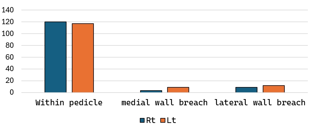 All screws were placed using an ipsilateral approach by right-handed surgeons (i.e., right screws inserted from the right side, left screws from the left). Among the 336 right-sided screws, 327 (97.3%) were classified as safe breaches (Grades A and B), and 9 (2.7%) were dangerous breaches (Grades C, D, and E). In comparison, among 345 left-sided screws, 330 (95.7%) were safe breaches, and 15 (4.3%) were dangerous breaches. The difference was not statistically significant (p = 0.50). These findings suggest consistent screw placement accuracy irrespective of screw laterality and surgeon handedness.