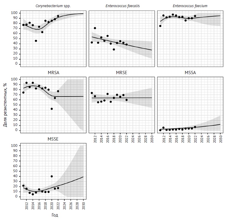Methods. We performed a retrospective study of data on the antimicrobial susceptibility in leading Gram(+) bacteria isolated from patients who were treated from 01.01.2022 to 31.12.2022. Based on the data obtained, we investigated the dynamics and determined the prognosis of resistance in leading Gram(+) pathogens. This article analyzes 5 groups of antibiotics active against Gram(+) microorganisms: fluoroquinolones, sulfonamides, tetracyclines, lincosamides, fosfomycin.