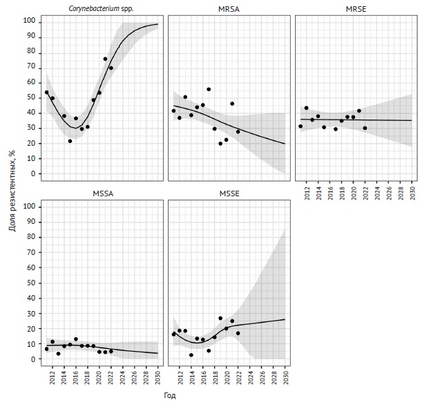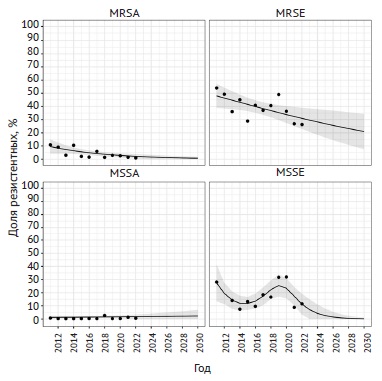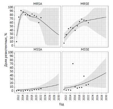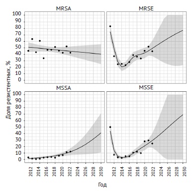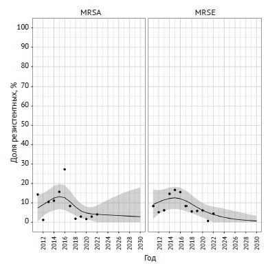 Более 75% штаммов MRSA демонстрировали устойчивость к фторхинолонам, при этом наблюдался незначительный тренд к снижению доли резистентных штаммов до 67 и 69% соответственно для мокси- и ципрофлоксацина к концу срока наблюдения. Доля устойчивых к лево- и ципрофлоксацину штаммов MRSE на протяжении 12 лет наблюдения колебалась в диапазоне 56–69% без каких-либо закономерностей. Динамика выделения резистентных к моксифлоксацину штаммов MRSE имела волнообразную структуру с общей тенденцией к увеличению (рис. 2).