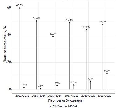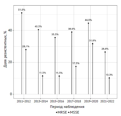 Динамика выделения устойчивых к ко-тримоксазолу штаммов S. epidermidis имела волнообразное течение с трендом к снижению. В 2021–2022 гг. только 10% MSSE и 27% MRSE были резистентными к данному препарату (рис. 3, 4).