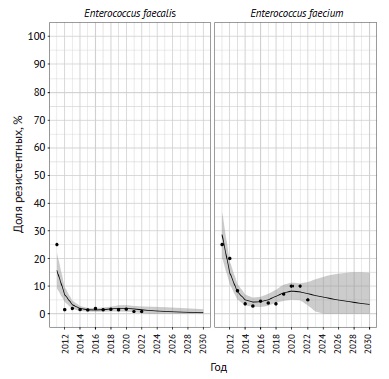 E. faecalis (n = 449) | 45,6 (41,4–47,6) | н/д | н/д |
