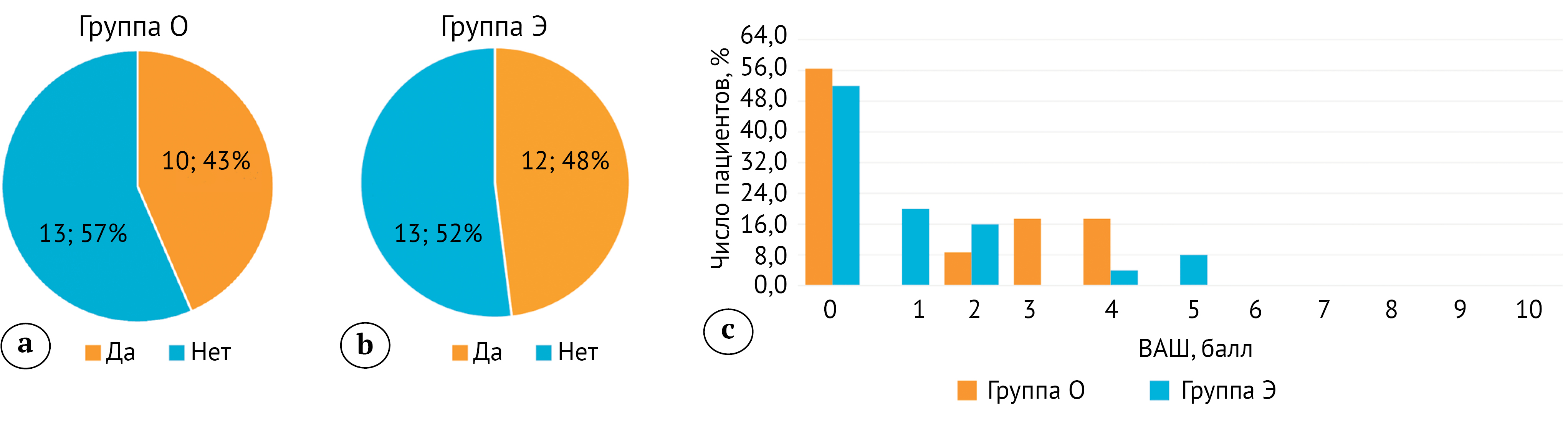 Рисунок 1. Результаты оценки остаточного болевого синдрома: а, b — наличие остаточного болевого синдрома; c — интенсивность остаточного болевого синдрома по ВАШ