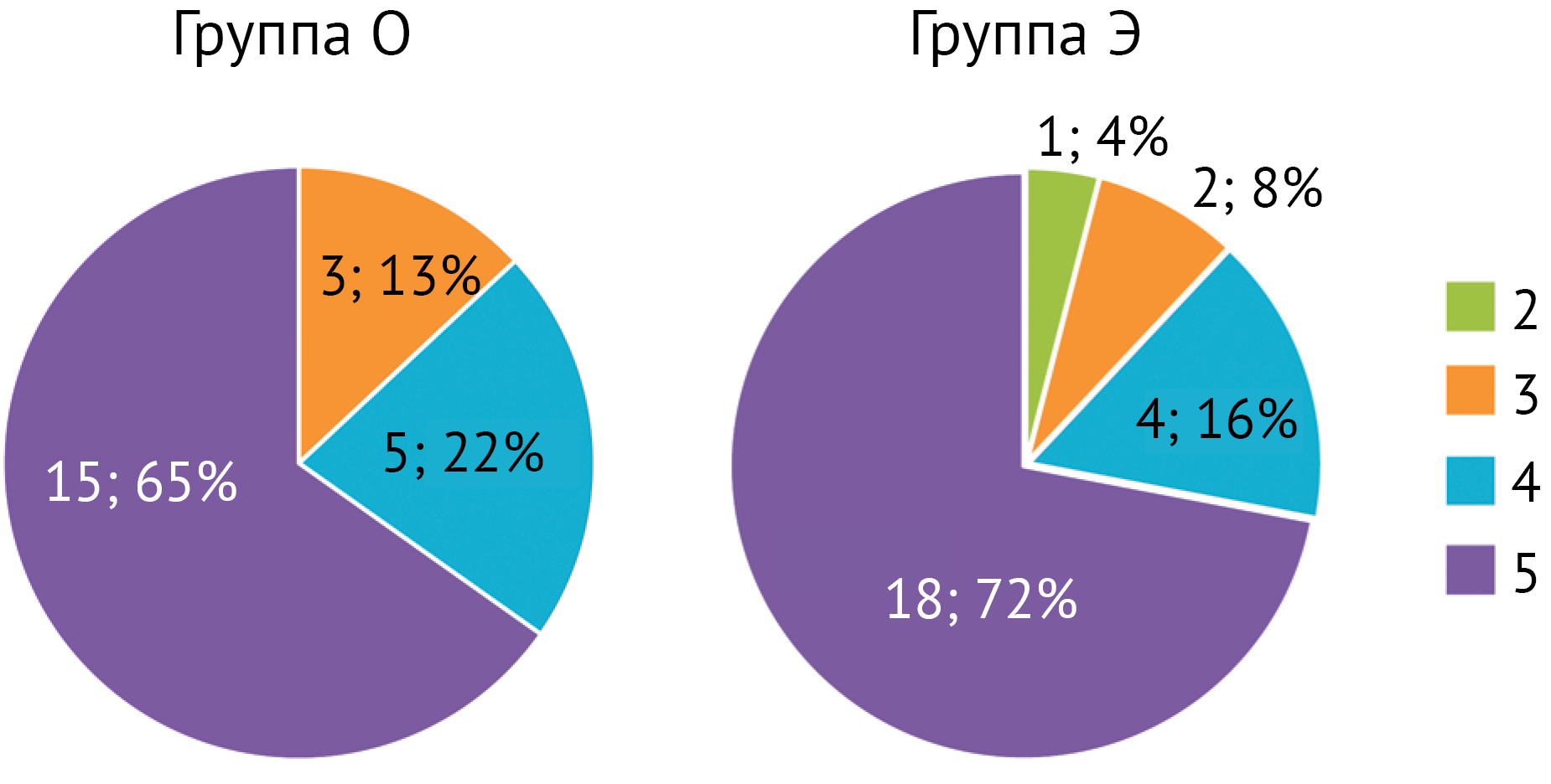 Доля пациентов, которые оценили результат лечения по 5-балльной шкале на 4 и 5, была практически одинаковой в обеих группах — 87% в группе О и 88% в группе Э (рис. 4). При проведении теста Манна – Уитни также не было выявлено статистически значимых различий между группами (p = 0,54).