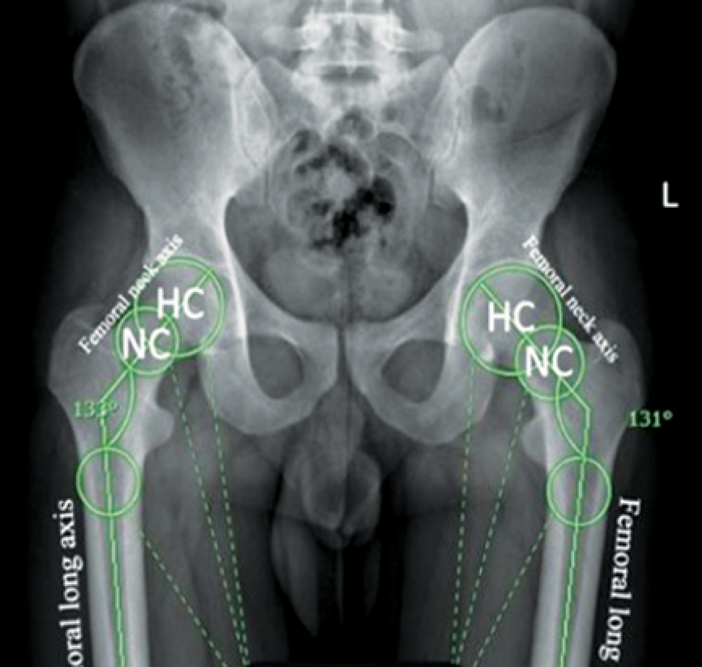 Figure 1. Neck-shaft angle measurements on an upright pelvis plain X-ray