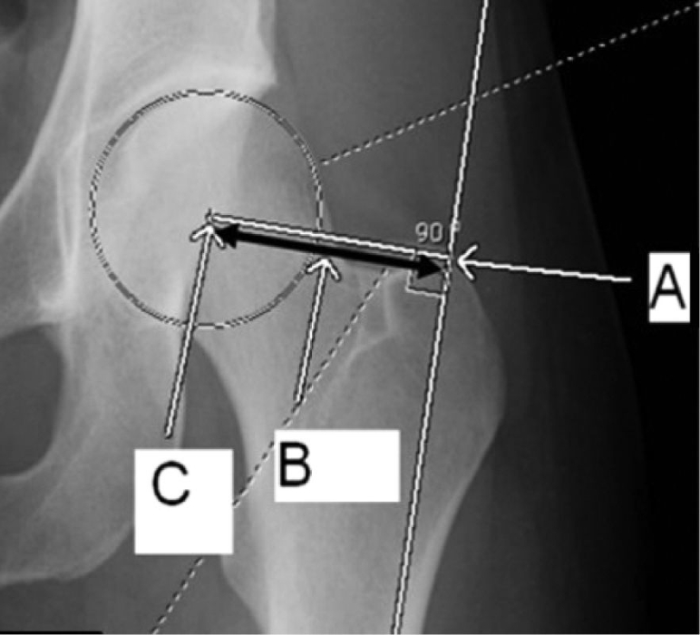 Figure 2. Calculation of the wedge effect (net lateralization of the shaft compared to the head/neck segment): line B represents the distance from the center of the femoral head (C) to the lateral femoral shaft (A)