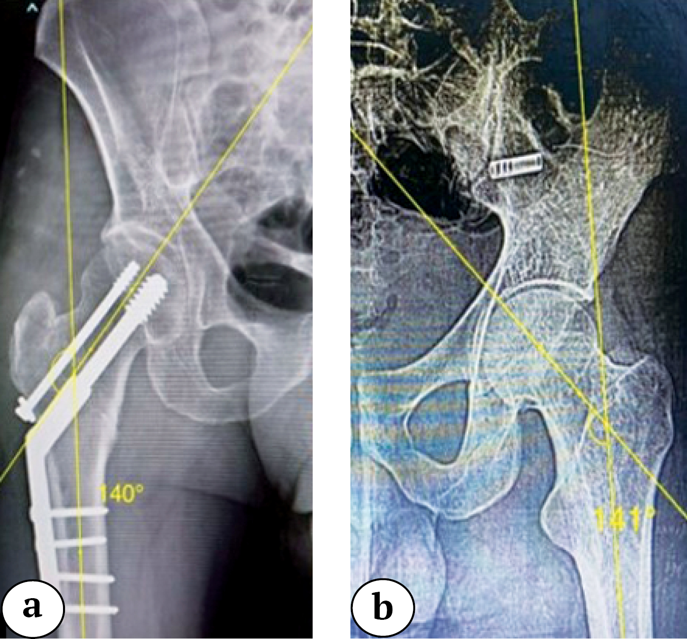 Figure 3. X-ray of a patient from the DHS group: a — postoperative neck-shaft angle; b — neck-shaft angle of contralateral unaffected side