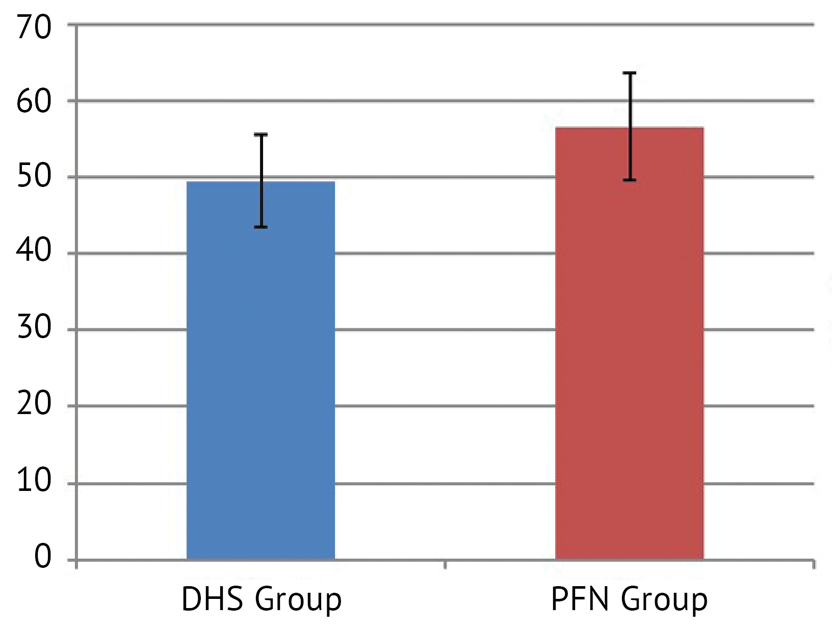 Results. In the PFN group, the mean postoperative neck-shaft angle (131.30±4.54°) showed a varus change compared to the intact side (134.70±3.77°), but the difference was not statistically significant (p = 0.109). In the DHS group, there was no significant difference (p = 0.827). Femoral shaft lateralization on the injured side was significantly higher in the PFN group (56.60±7.07 mm) than in the DHS group (49.50 ± 6.59 mm; p = 0.002). No significant difference was found on the non-injured side (p = 0.261).