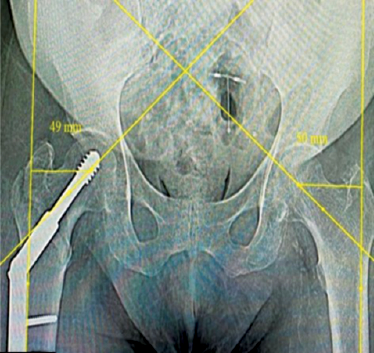 Figure 6. X-ray of a patient from the DHS group, showing femoral shaft lateralization (uninjured side — 50 mm, injured side — 49 mm)