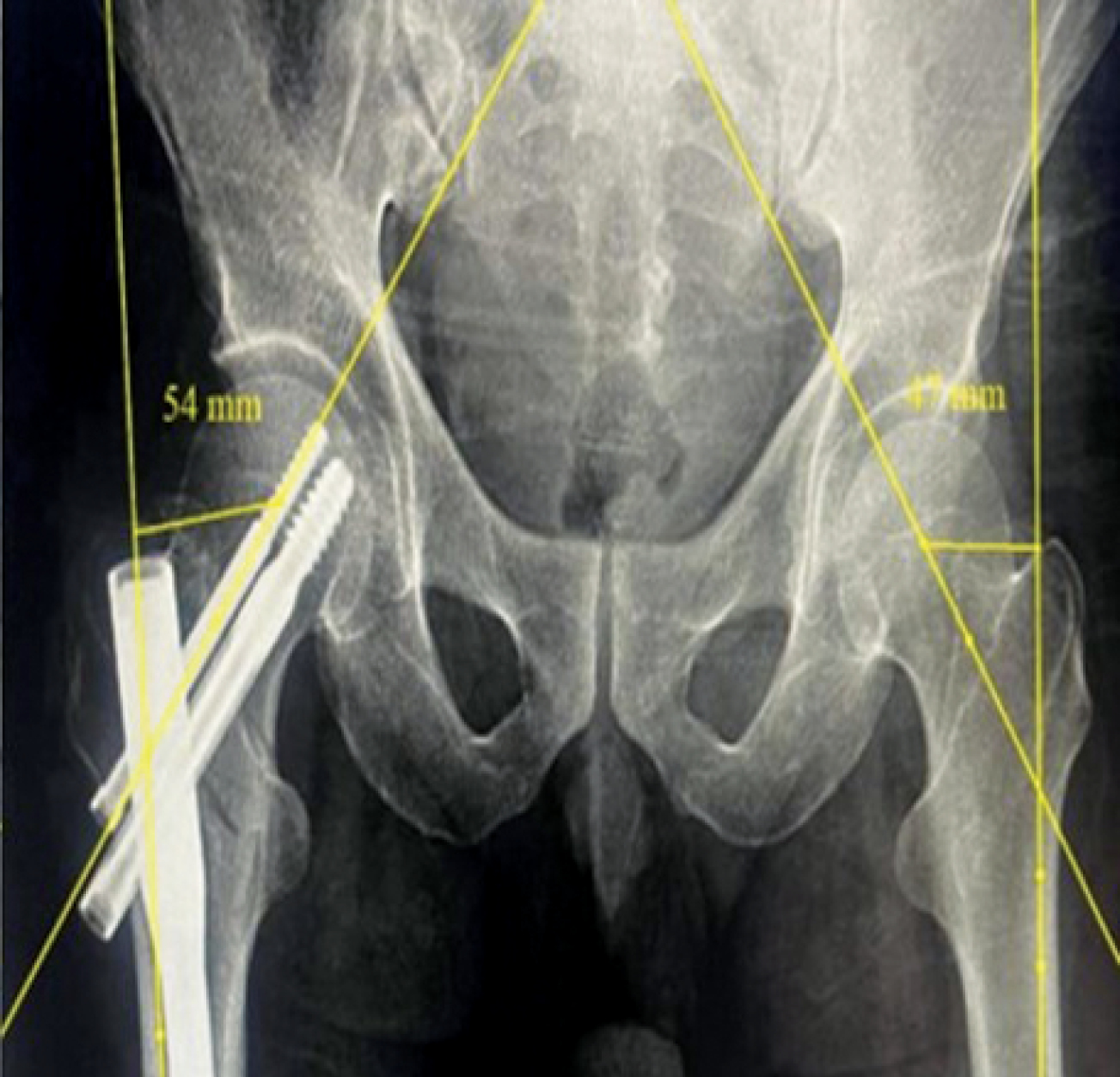 Figure 7. X-ray of a patient from the PFN group, showing femoral shaft lateralization (uninjured side — 47 mm, injured side — 54 mm)