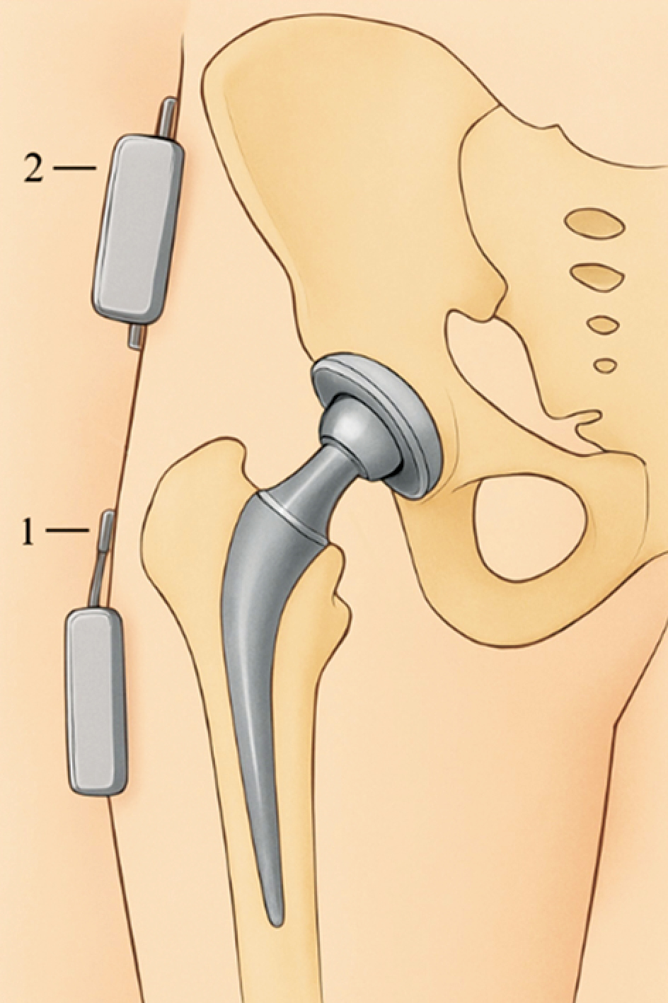 Устройство фиксируется на поверхности кожи в области протезированного сустава с помощью медицинского пластыря (рис. 1) в двух вариантах: в области большого вертела (1-й вариант) или, при наличии в проекции большого вертела выраженной подкожной жировой ткани, в области передневерхней ости подвздошной кости (2-й вариант). Эти зоны являются наиболее доступными и легко определяемыми пальпаторно.