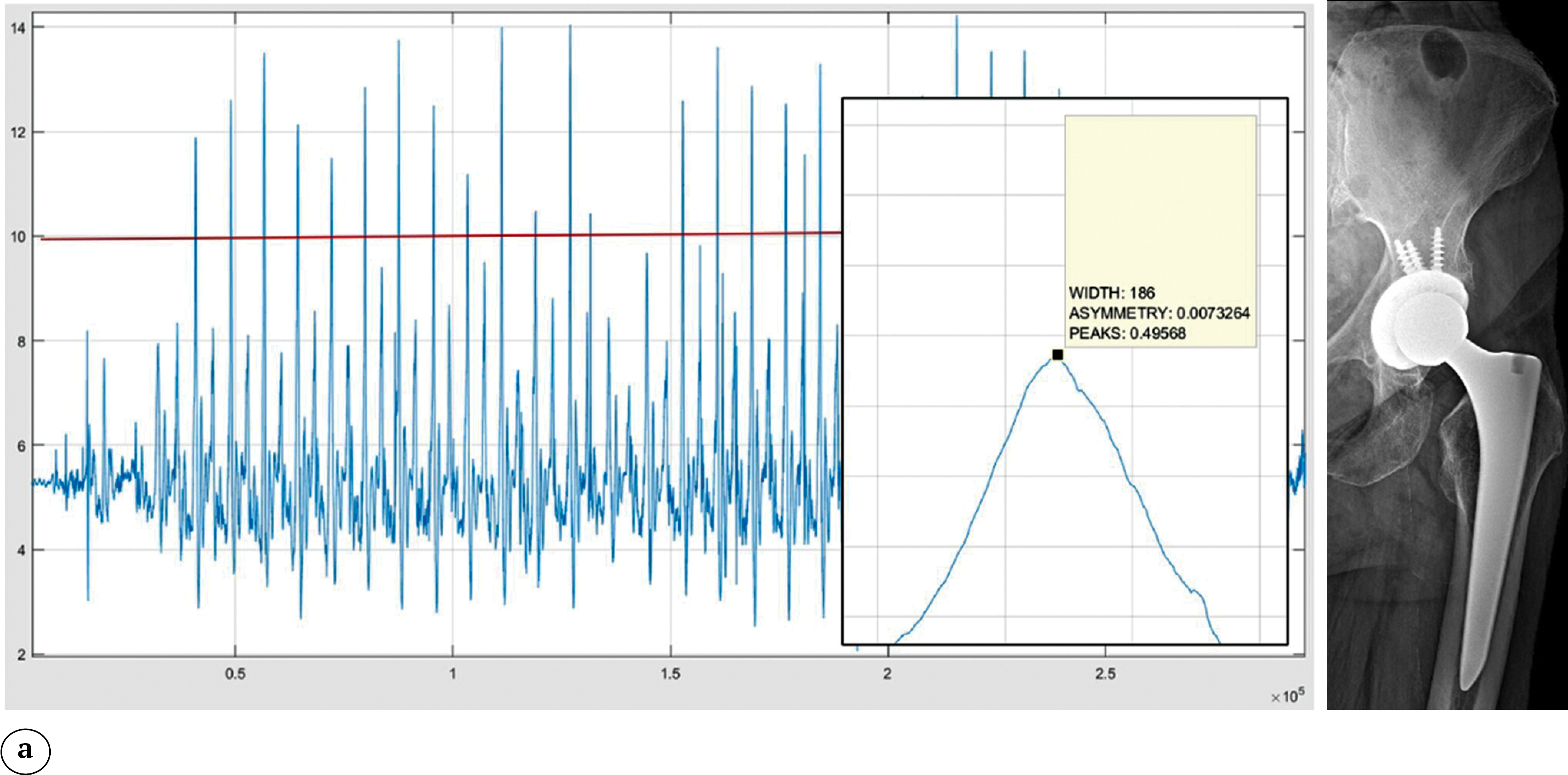 Рисунок 3 (b, c). Общий вид акустических сигнатур, детализация отдельно взятых вершин импульсов и рентгенограммы тазобедренного сустава в прямой проекции: b — с износом полиэтиленового вкладыша, но без расшатывания компонентов; c — с расшатыванием вертлужного компонента (пролапс) и бедренного компонента (stress shielding, резорбция зон Gruen 6, 7) эндопротеза тазобедренного сустава