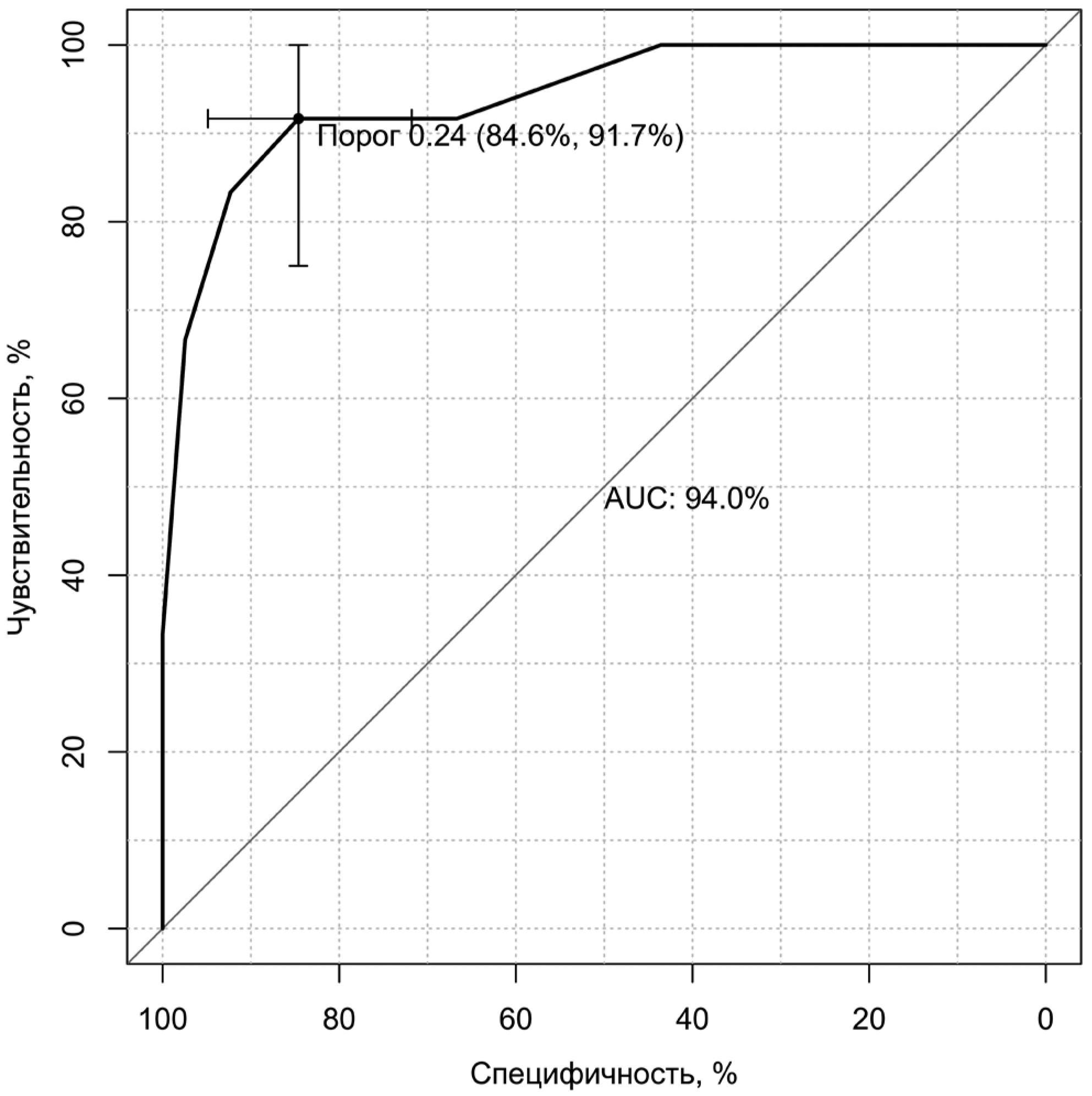 Диагностическое отношение шансов | 60,5 (6,5–559,4) |