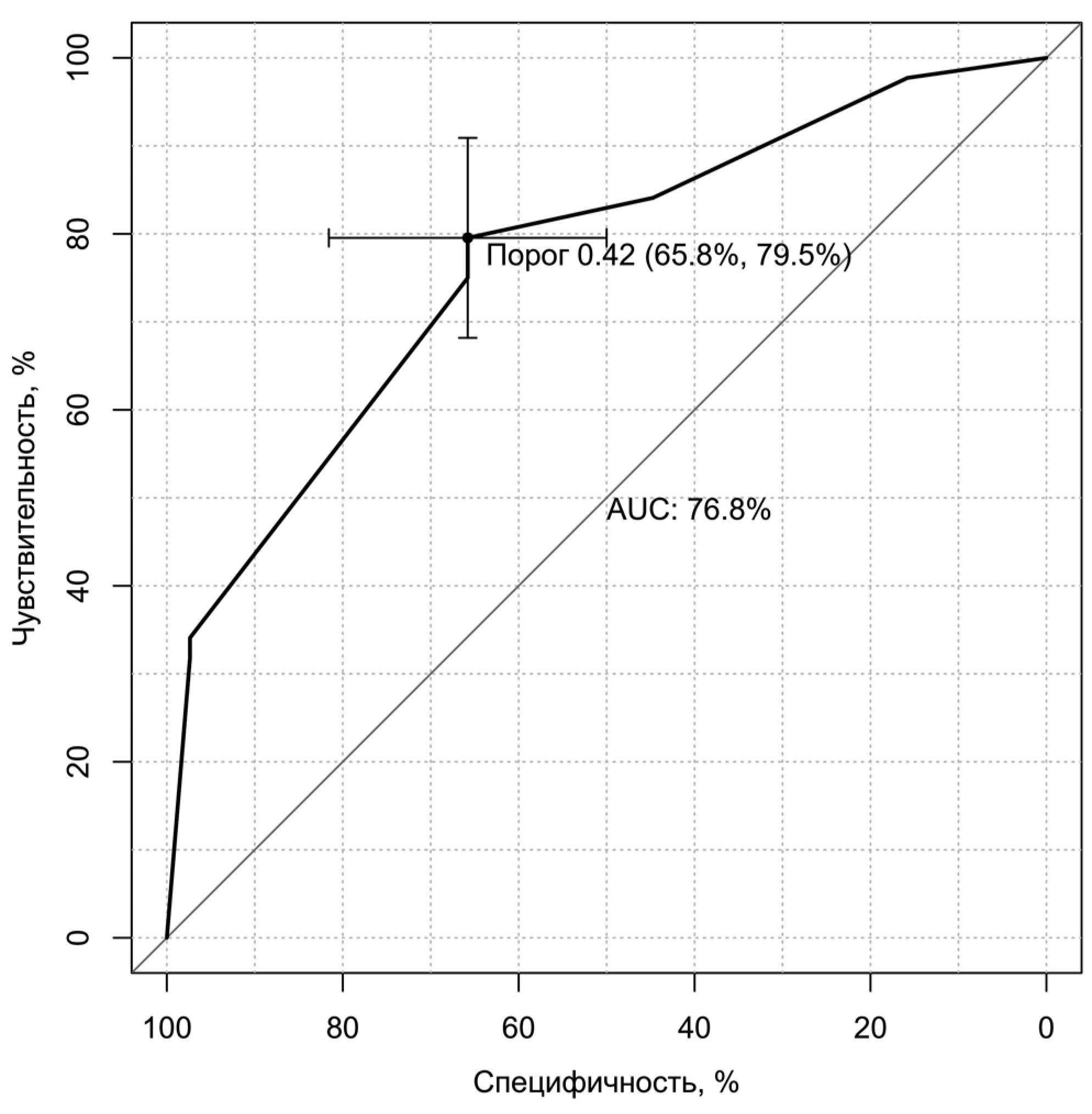 Рисунок 5. ROC-кривая (пороговое значение 42,5%) многофакторной модели риска расшатывания/разрушения компонентов эндопротеза