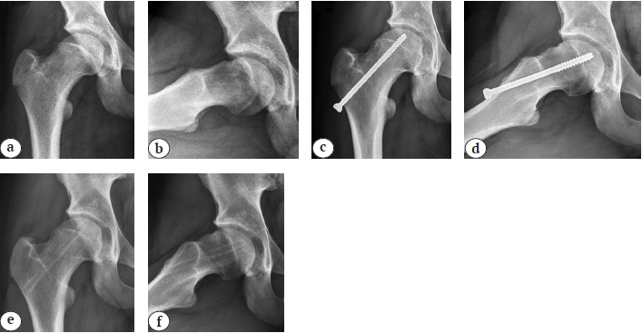 Fig. 6. X-rays of the right hip in the anteroposterior and in the Lauenstein projections of patient 14 years 9 months old: a, b — before the surgery; c, d — 2,5 years after surgery, before removal of hardware; e, f — 3,5 years after surgery, at the final examination at the 19th year of life