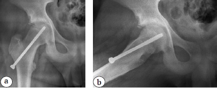 All children underwent surgical treatment that consisted of fixation of the proximal epiphyses of both femurs under C-arm fluoroscopy. Self-tapping cannulated screws 7.0 mm with external thread for ¼ of their overall length were used. The screw was introduced into the epiphysis from the anteroexternal surface of the femur through its neck and the center of the growth plate so that the screw head was not based on the cortical layer and was spaced away by 5-10 mm (Fig. 1).