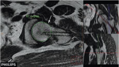 Fig. 3. MRI of the left hip (oblique axial projection, T2 weighted image) of patient 18 years 2 months old, 4 years 7 months after surgery. Deformation of head-neck junction (indicated by an arrow) — lack of normal concavity of transition and increased anterior-superior angle α to 87.4°