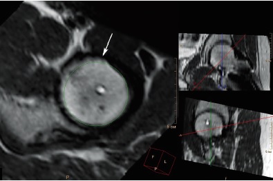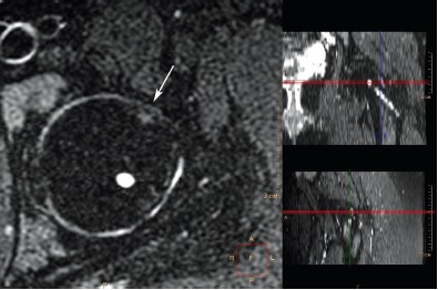 Fig. 4. MRI of the left hip (radial section at the level of head-neck junction perpendicular to the femoral neck axis, T2 weighted image) of patient 18 years 7 months old; 5 years 2 months after surgery: deformation of head-neck junction (indicated by an arrow)— excess bone mass in the anterior-superior part of the transition, which damages sphericity of the femoral head