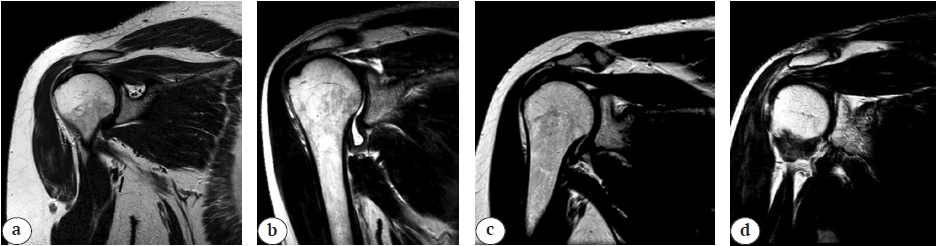 Figure 1. Anatomical variations of the scapular notch, according to the Rengachary classification: a — type I; b — type II; c — type III; d — type IV; the scapular notch area was assessed in the oblique coronal view using T2 TSE mode