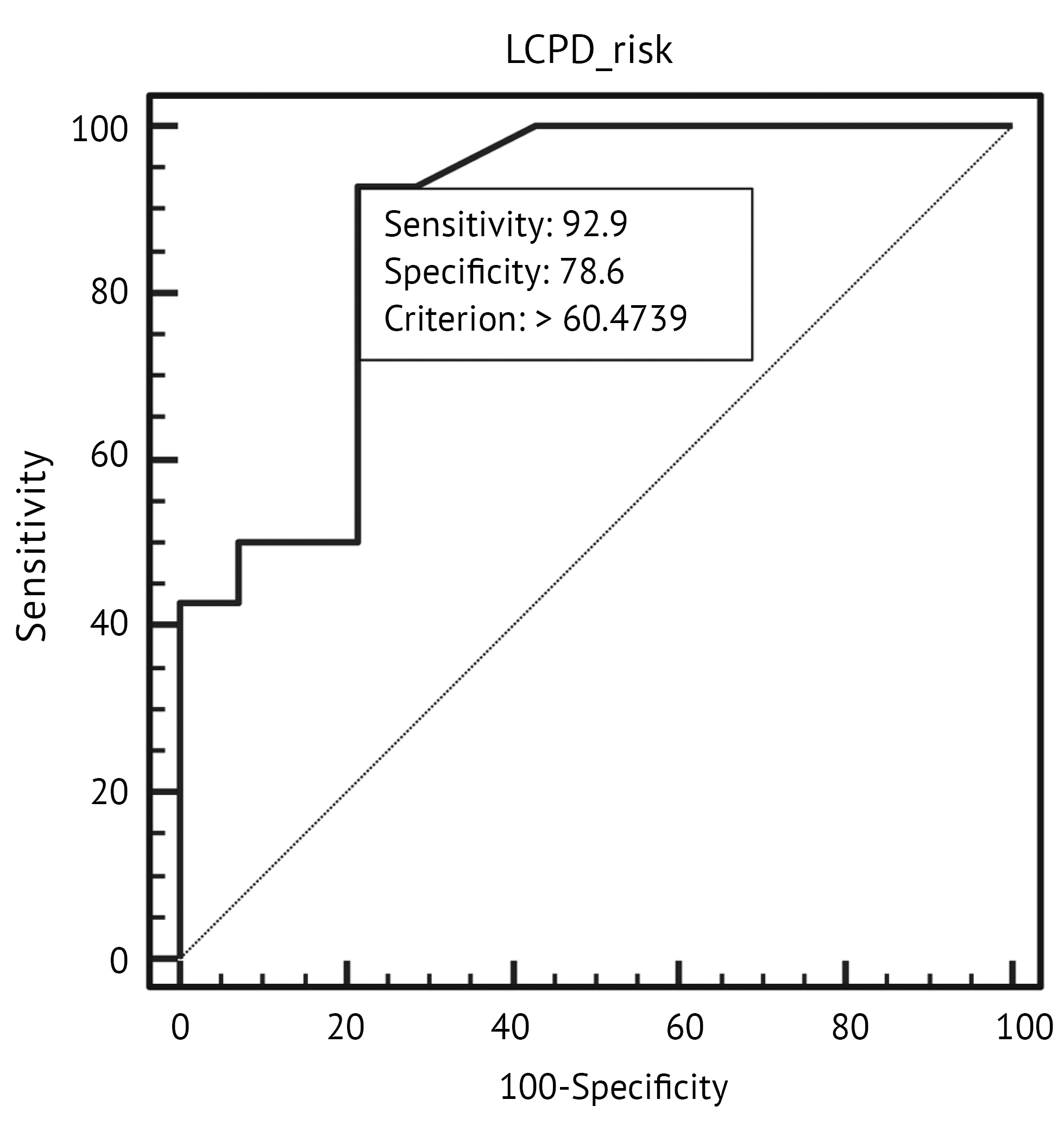 The sensitivity and specificity of the develo-ped equation for predicting the risk of LCPD based on inflammatory changes in synovial fluid exceeded 78%, indicating high diagnostic performance.The discrimination threshold was 60.47%. The AUC was significantly higher than that of a random classifier.