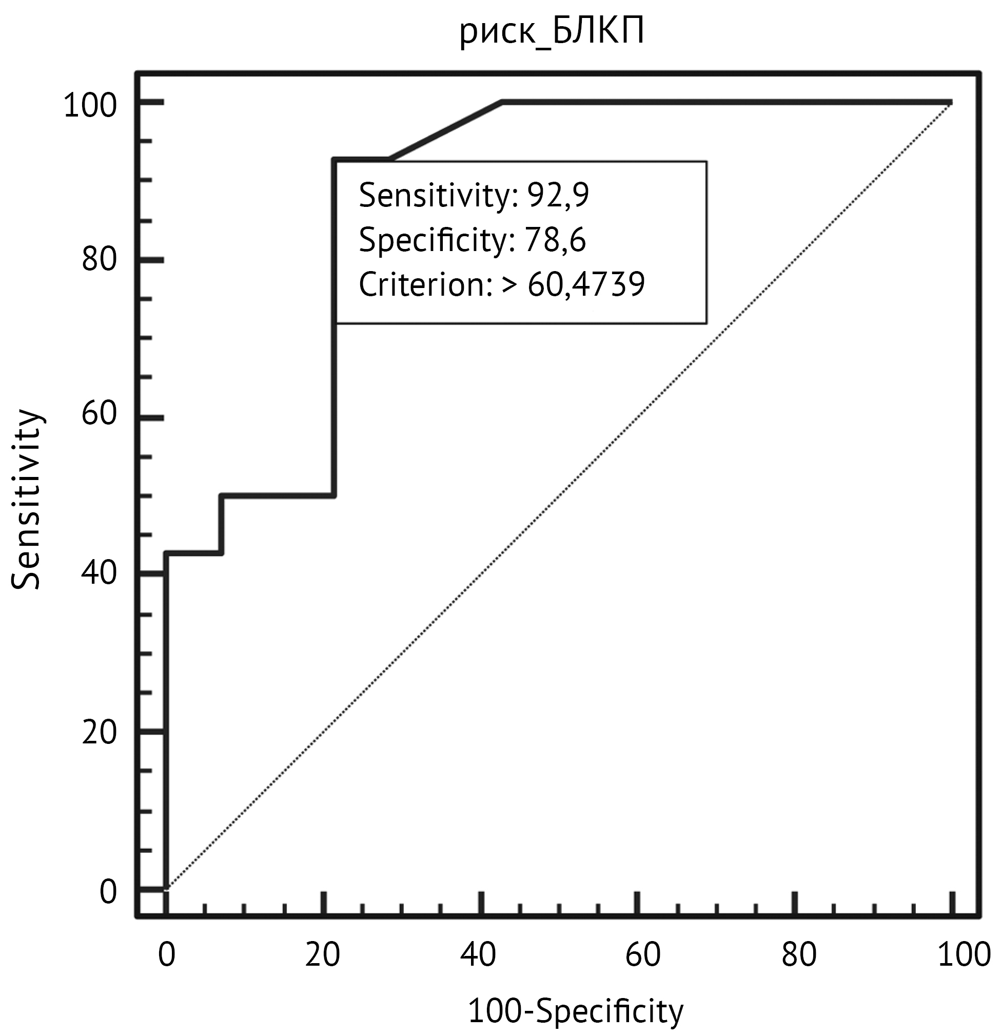 The sensitivity and specificity of the develo-ped equation for predicting the risk of LCPD based on inflammatory changes in synovial fluid exceeded 78%, indicating high diagnostic performance.The discrimination threshold was 60.47%. The AUC was significantly higher than that of a random classifier.