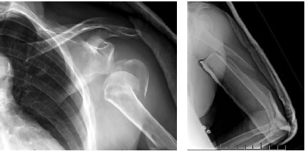 2. Fig. 1. X-rays of the left shoulder at admission: multi-comminuted fracture of the proximal and middle thirds of the humerus, dislocation of the humeral head