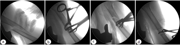 3. Fig. 2. Intraoperative X-rays: a — humerus diaphysis fragments displacement; b — reposition of the humerus shaft, lag screws insertion; c — loss of reposition; d — removal of lag screws, cerclages ostheosynthesis
