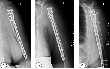4. Fig. 3. Postoperative X-ray’s after osteosynthesis of the humerus with a PHILOS Long plate and cerclages: a — frontal view; b — lateral view; c — oblique view