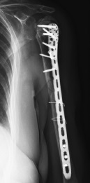After patient examenation and preparing for surgical treatment open direct repositioning and plate osteosynthesis were performed through the deltoid-pectoral approach with an additional lateral approach. Surgical treatment was performed in the beach-chair position.