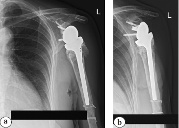 Fig. 5. Shoulder X-rays in the early postoperative period after left shoulder arthroplasty: a — Y-shaped view; b — direct view