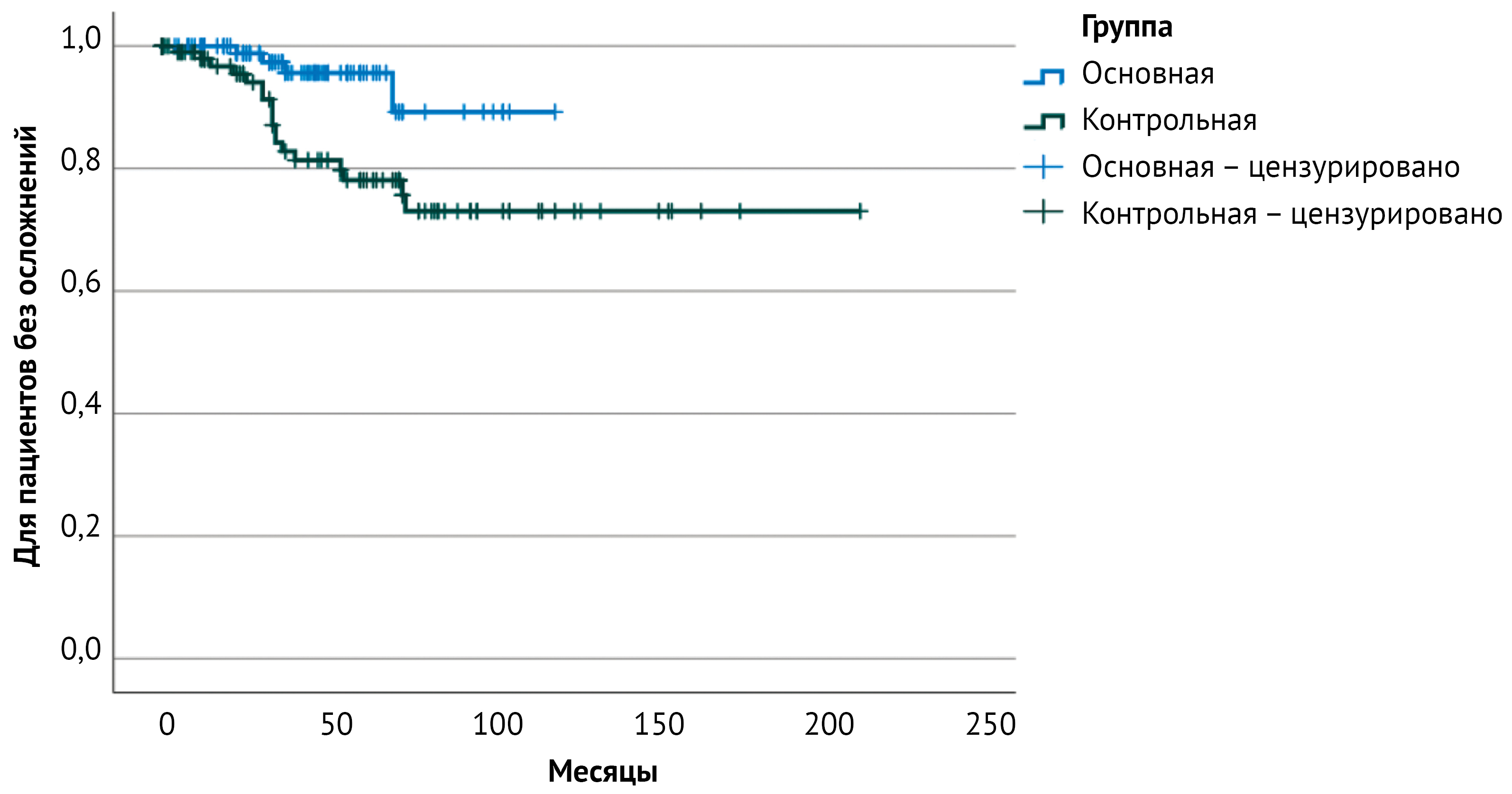 Анализ сроков до наступления осложнений проводили с использованием метода Каплана – Майера. Различия между полученными кривыми оценивали с помощью теста Мантеля – Кокса (Log-rank test). Для определения влияния принадлежности пациентов к основной или контрольной группе и расчета отношения рисков (ОР) применяли регрессию Кокса.