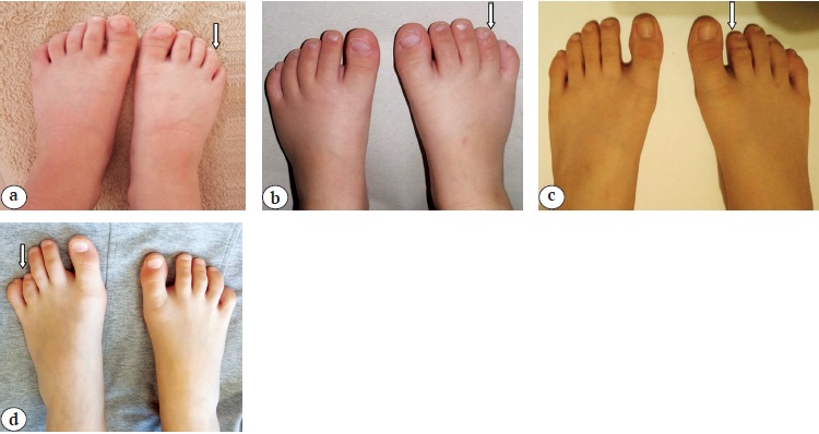 Forty operated patients were distributed into four groups based on the degree of shortening of the donor toes compared with the contralateral foot by performing physical examination of the feet (Fig. 1). The middle phalanx of toes II or IV was harvested in 78% of children without shortening or with minor shortening of the donor toes. One child underwent middle phalanx transplantation of toe II, while the rest of the proximal phalanges of toe II (1 patient) or toe IV (6 patients), in the group of patients with moderate shortening of the donor toe (8 children). The main phalanx of toe IV was previously harvested in the 11 children with a pronounced toe shortening (by >1 nail plate).