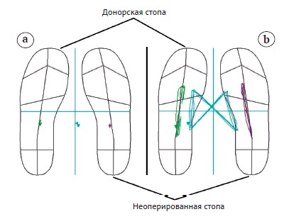 Results. After donor feet examination in the long-term period, lots of them showed a linear shortening of the donor toes compared to the contralateral foot, which was recorded by a computer planto-podometric method for evidence. The barodinamoplantographic study did not show significant signs of a decrease in the support ability of the foot, which could be associated with non-vascularized toe phalanx transfer. When walking, there were no obvious signs of impaired motor functions of the donor foot.