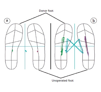 Among 12 patients, 4 had previously undergone phalanx transplantation of both feet. One patient underwent transplantation of the main phalanges of toe IV, two patients of the middle phalanges of toe IV, one patient of the main phalanx of toe IV of the left foot and the middle phalanx of toe IV of the right foot, one patient of the middle phalanx of toe II of the right foot, three patients of the main phalanx of toe IV, and seven patients of the middle phalanx of toe IV. Concurrently, one patient underwent plantography and podometry twice, which was a year after the middle phalanx transplantation of toe IV of the right foot, and 2 years after the examination and a year after the middle phalanx transplantation of toe IV of the left foot.